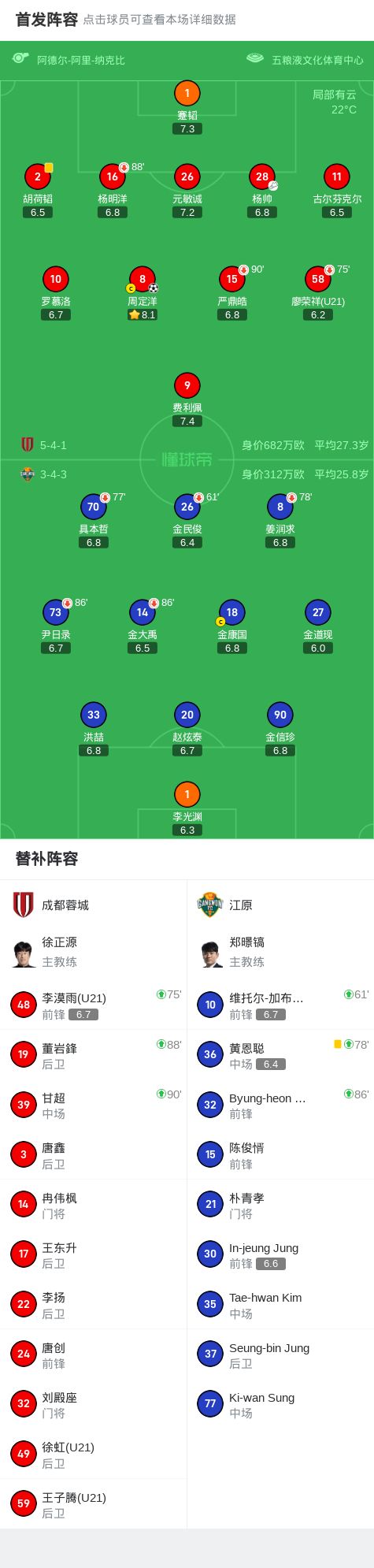 第90+2分钟,成都蓉城换人调整,甘超替补登场