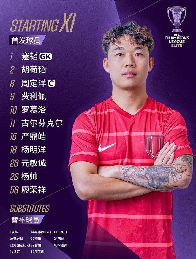 成都蓉城首发:1-蹇韬、2-胡荷韬、11-古尔芬克尔、26-元敏诚、28-杨帅、8-周定洋、10-罗慕洛、15-严鼎皓、16-杨明洋、58-廖荣祥、9-费利佩